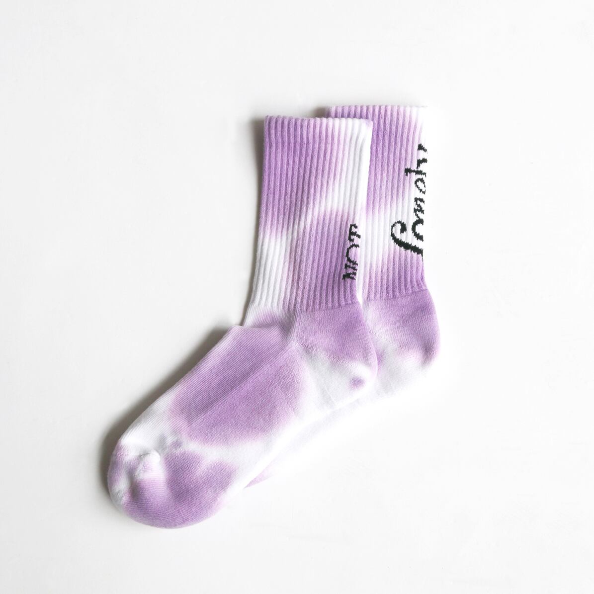 コットン糸でNot Lonelyロゴをジャカード織りで表現したソックス。底面は吸汗を考慮したパイル編み。手作業によるパープルのタイダイ染め。オリジナルステッカー二枚入り。日本製。